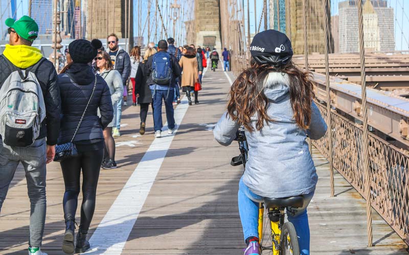 Bike across the historic wooden panels of the Brooklyn Bridge